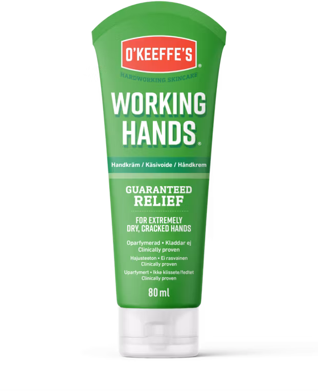 O'Keeffe's Working Hands är handkrämen för dig som arbetar mycket med händerna. Den oparfymerade och doftfria handkrämen mjukar effektivt upp torra händer, stimulerar hudens naturliga reparationsprocess genom återfuktning, justerar pH-balansen och hjälper huden att bibehålla fukten. Svåra sprickor och extremt torra partier repareras och lindras effektivt. Helt fri från fett och kladdar inte.
